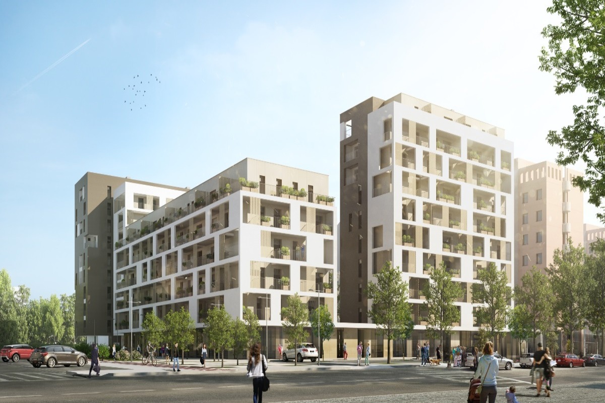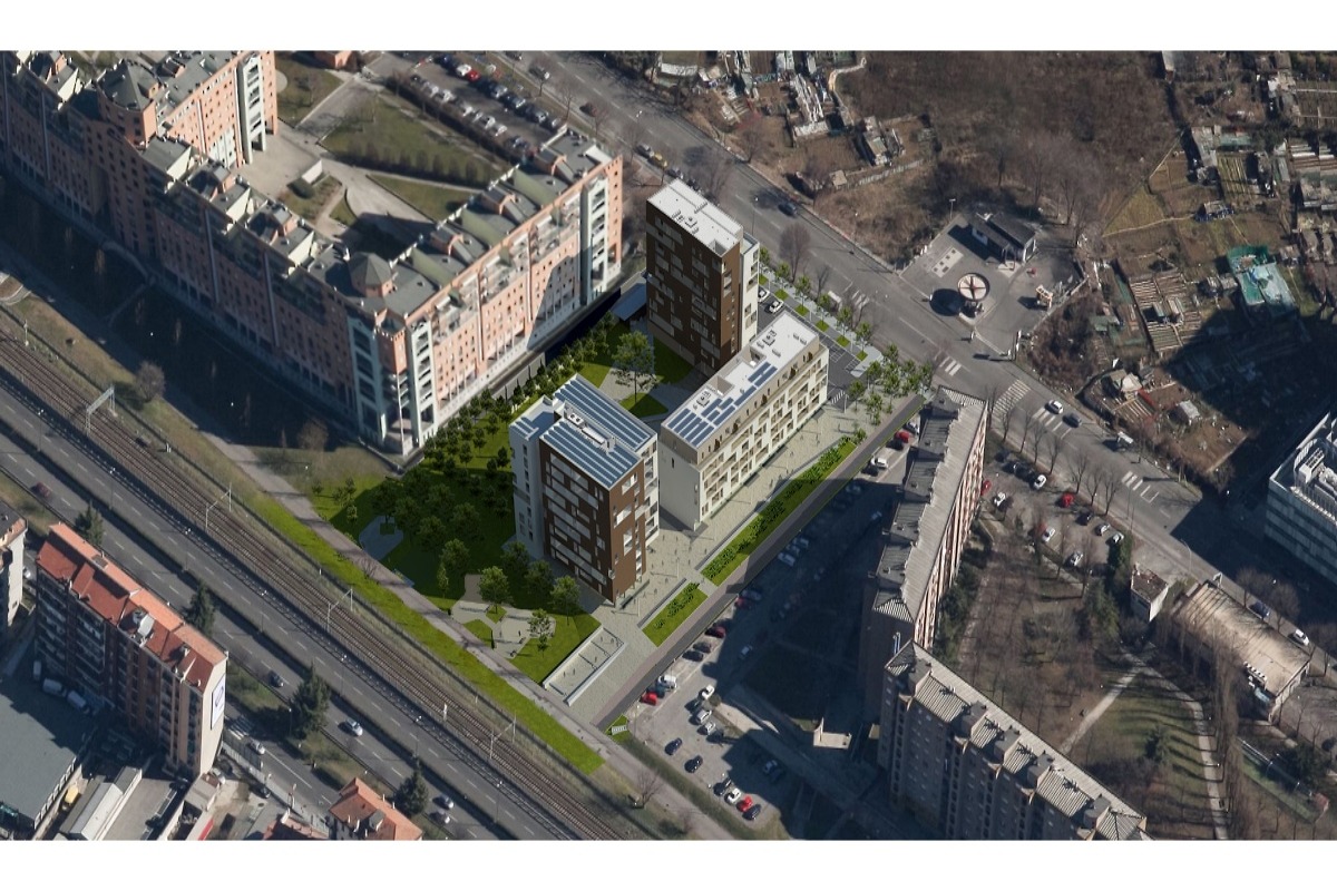 Il progetto si compone di 2 torri da 10 piani ed 1 edificio in linea da 6 piani organizzati intorno ad una corte destinata a verde.