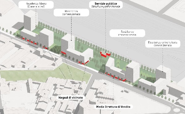 - spazi pubblici e servizi di quartiere al piano terra degli edifici residenziali oltre all’attrezzatura pubblica polifunzionale;