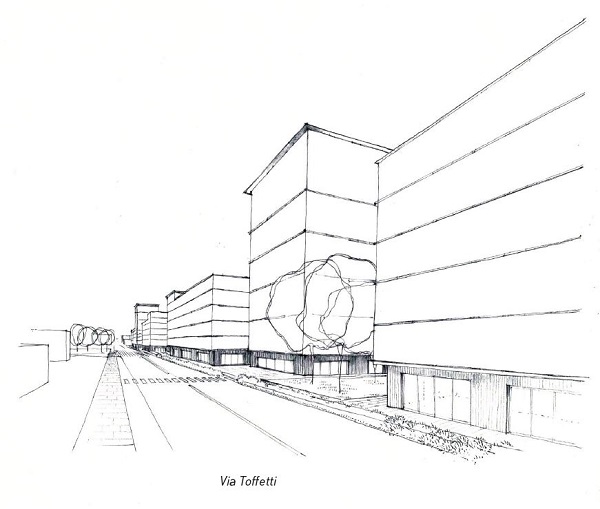 - edifici che riprendendo, in parte, gli allineamenti e le direttrici degli isolati preesistenti, si configurano come corti aperte verso il Parco pubblico e, allo stesso tempo, creano una nuova cortina urbana lungo la via Toffetti;