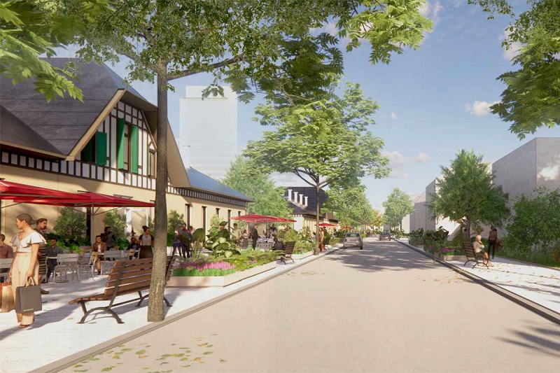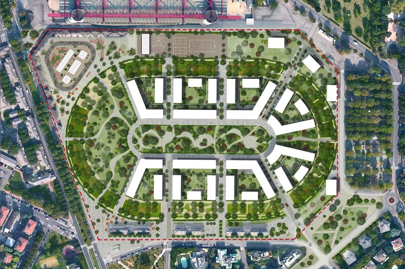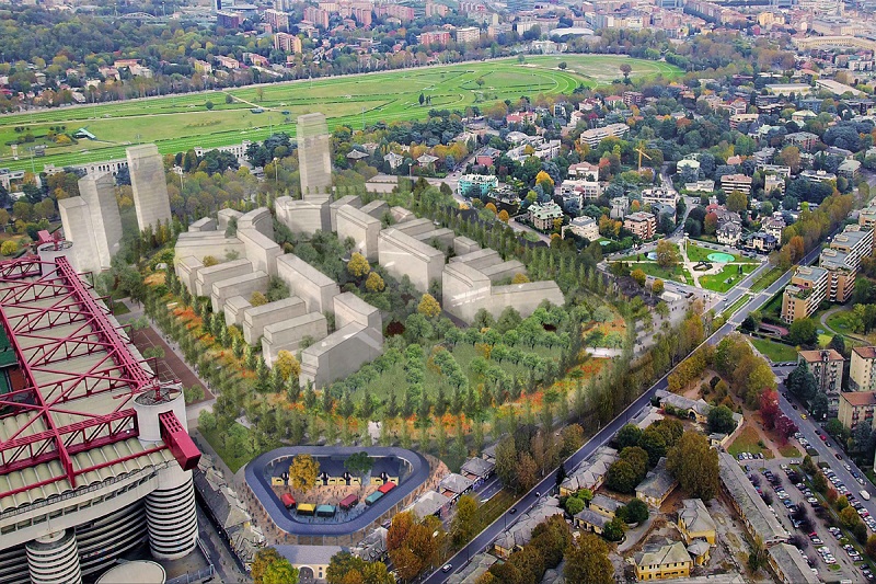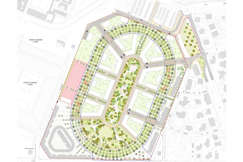 L’intervento propone la realizzazione di un nuovo quartiere residenziale caratterizzato dalla presenza di servizi per il quartiere ricavati all’interno degli immobili vincolati e da un sistema di spazi a verde; il progetto degli spazi aperti reinterpreta il tracciato dell’impianto storico della pista del Trotto che verrebbe recuperata come tracciato di verde lineare e disegna uno spazio a piazza-giardino centrale su cui affacciano le nuove residenze, aperto verso sud e verso l’Ippodromo e permeabile trasversalmente per collegare gli spazi a verde e i nuovi servizi.