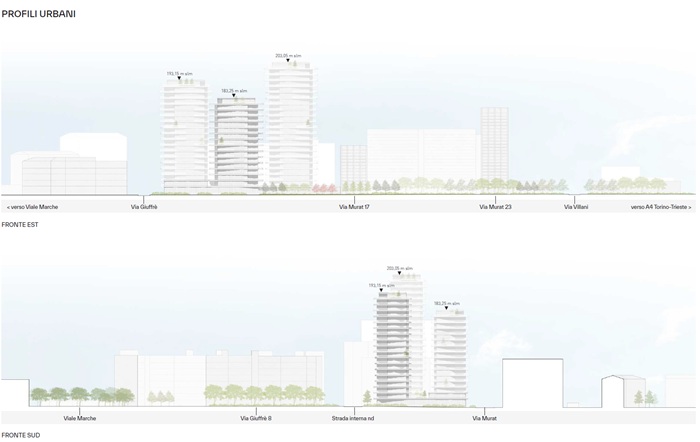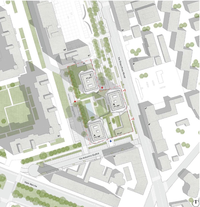 L’intervento privato prevede la realizzazione di tre torri residenziali, per una superficie lorda di circa 16.536 mq, collegate tra loro da due piani interrati dedicati a parcheggio e da una piastra a piano terra che ospita servizi per la residenza privata, oltre a una media e a una piccola struttura di vendita accessibile sia da via Murat che da via Giuffrè.
