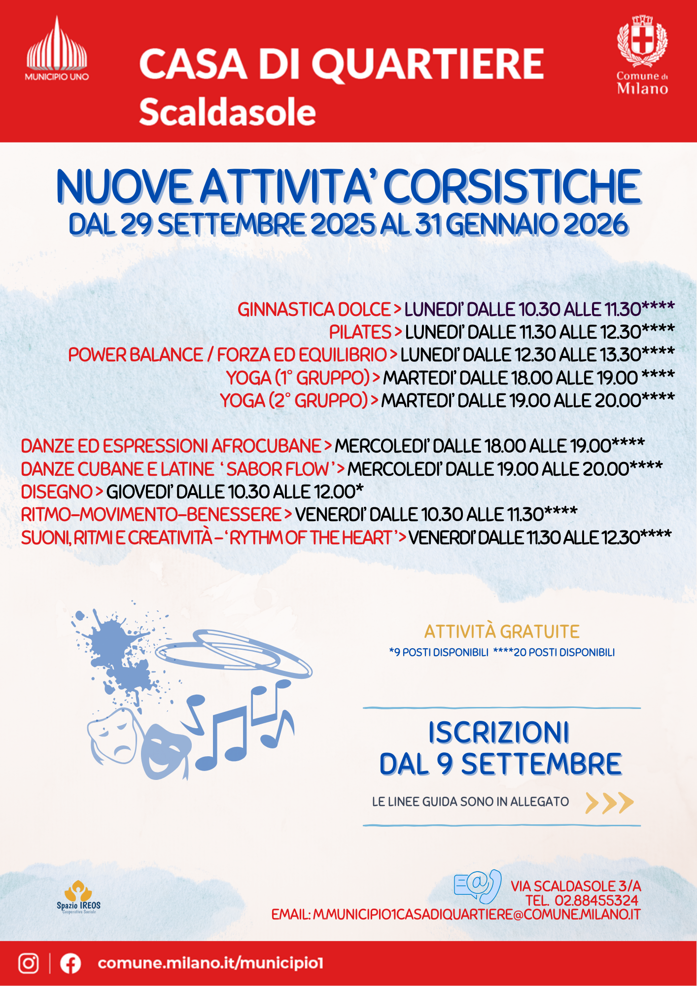 A partire dalle ore 10:30 di martedì 9 settembre sino alle ore 23:59 di domenica 21 settembre è possibile iscriversi alle attività proposte nelle Case di Quartiere del Municipio 1.