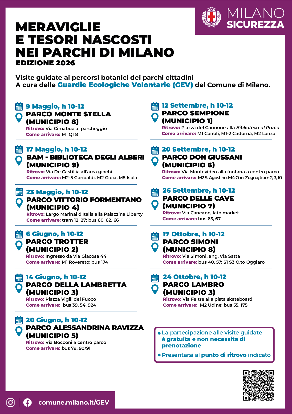 L’iniziativa, che si svolge nei diversi Municipi nel periodo maggio – ottobre 2026, ha l’obiettivo di valorizzare il patrimonio ambientale urbano, favorendo la conoscenza delle aree verdi, della biodiversità e delle peculiarità naturalistiche presenti nei parchi di Milano.
